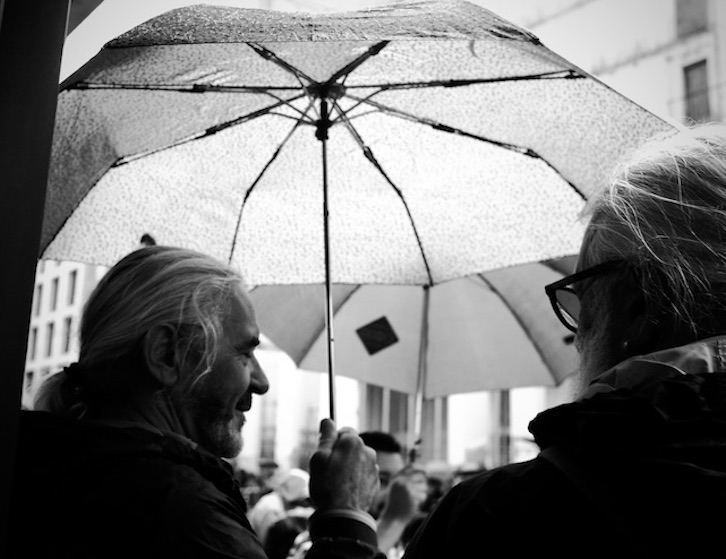 Non, un M-P (240) stock. Peut-être l’objectif, un MS-Optics 4/24 muni d’un filtre UV/skylight. Ces parapluies portaient un logo, ils n’étaient peut-être pas noirs mais violets, je ne sais pas. Une sortie de collègues de la même boite avec les pépins « maison ». Veni Vidi Vissi ! |