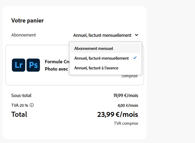 Pour DXO c'est une licence pas un abonnement https://shop.dxo.com/fr/dxo-photolab-9-elite.html 239,99€ les mises à jour majeur ( DXOphotolab10 par exemple) seront payantes ( mise à niveau) Pour LR c'est un abonnement donc les mises à jour sont incluses dans l'abonnement . Tu as au niveau du panier un petit triangle qui permet de choisir si tu veux mensuel ou annuel ![]() ![]() Leica M6 - M10 - M10M - SL2-S // Voigtlander 15mm f/4,5 - Zeiss 25mm f/2,8 - Leica 35mm f/2 - Zeiss 50mm f/1,5 - Leica 90mm f/2,8 |