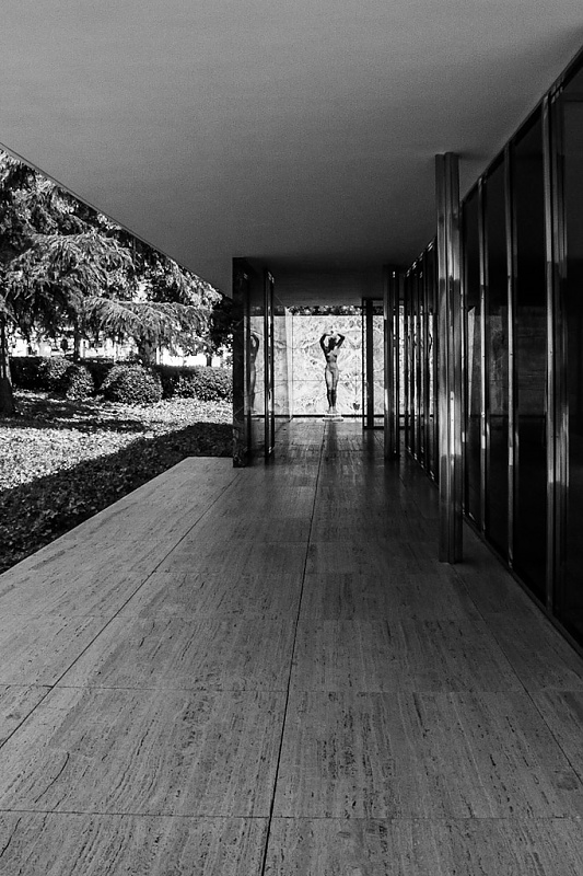 …entre le point de fuite (il n’y a que ça) et la statue. Parce que j’avais un peu honte que ce soit fait au d-lux 3, mais parce que c’est tout de même la relation d’un choc qui a passé outre tous les autres bonheurs pour les yeux et l’esprit que procure une visite à Barcelone. Je l’avais vu dans les livres, et là les les volumes, les matières, les lignes de fuite, tout devenait limpide. Pardonnez les maladresses de quelqu’un qui ne prétend pas photographier l’architecture, mais seulement la goûter.