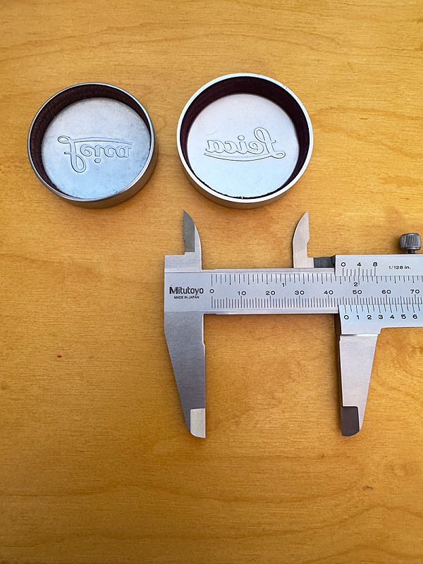 Je possede 2 vieux bouchons Leica (feutrine rouge), celui de gauche est celui de mon 50mm summicron, un A42 donc qui mesure un poil moins que 42 mm. Celui de droite mesure 42.5 mm, est trop large pour le summicron. Je pensais que c'était un bouchon de summitar, est-ce quelqu'un sait quel est son objectif ? |