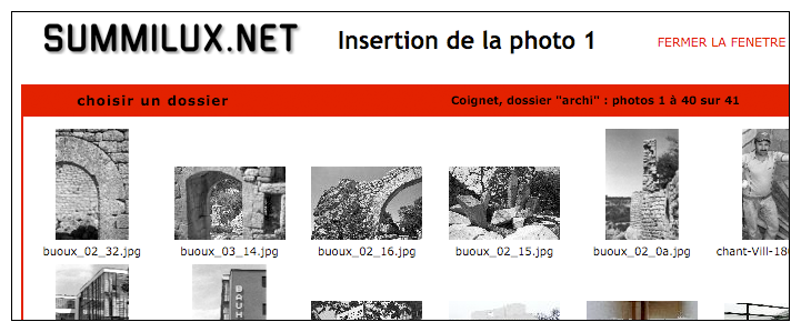 | Notez que la photo affichée en grand format est repérée dans la grille de petites images (que nous appellerons grille de navigation), au moyen d'un carré noir et blanc, en surimpression en bas à droite de la petite image. Ceci s'accompagne de facilités de navigation :